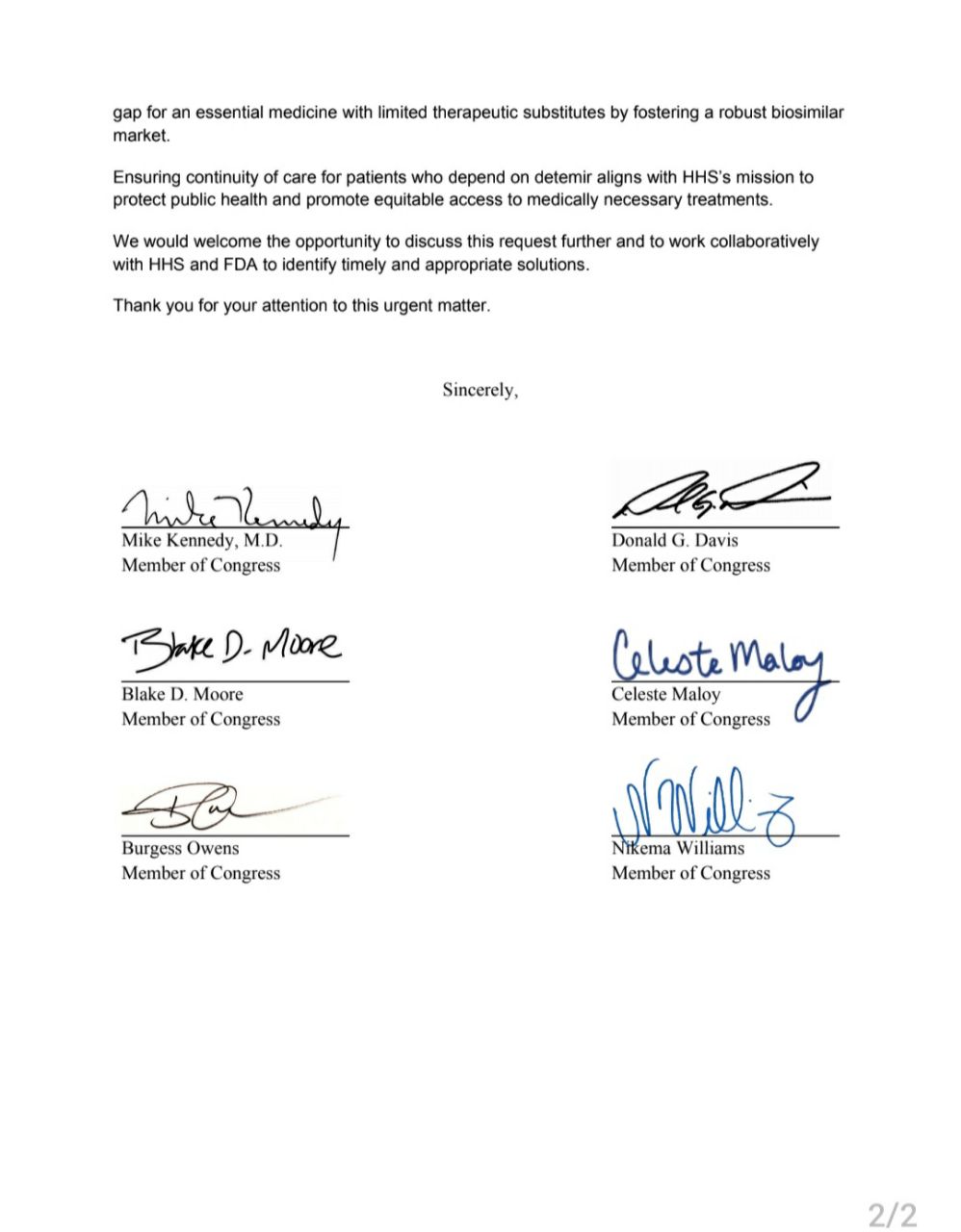 With insulin detemir no longer available in the United States, patients and clinicians are facing difficult and, in some cases, risky treatment transitions. In their letter, Members of Congress encourage HHS and FDA to explore existing authorities and regulatory pathways that could help preserve access to this clinically distinct insulin, while continuing to uphold the highest standards for safety and quality.